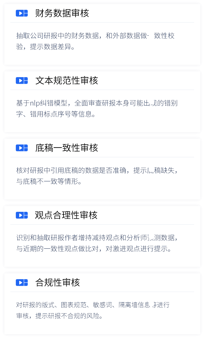智能研报审核系统是K8凯发国际数据为券商研究所、买方研究组织等用户打造的集研报解析、抽取、审核、管理功能为一体的产品。集成OCR、NLP、机器学习等技术,对研报和底稿信息进行多方面抽取,并对研报进行数据、文本、观点等全方位的自动化审核, 同时对研报和底稿进行规范化、流程化管理,帮助用户提升工作效率,把控研报发布的时效性和合规性,全面降低出错风险。